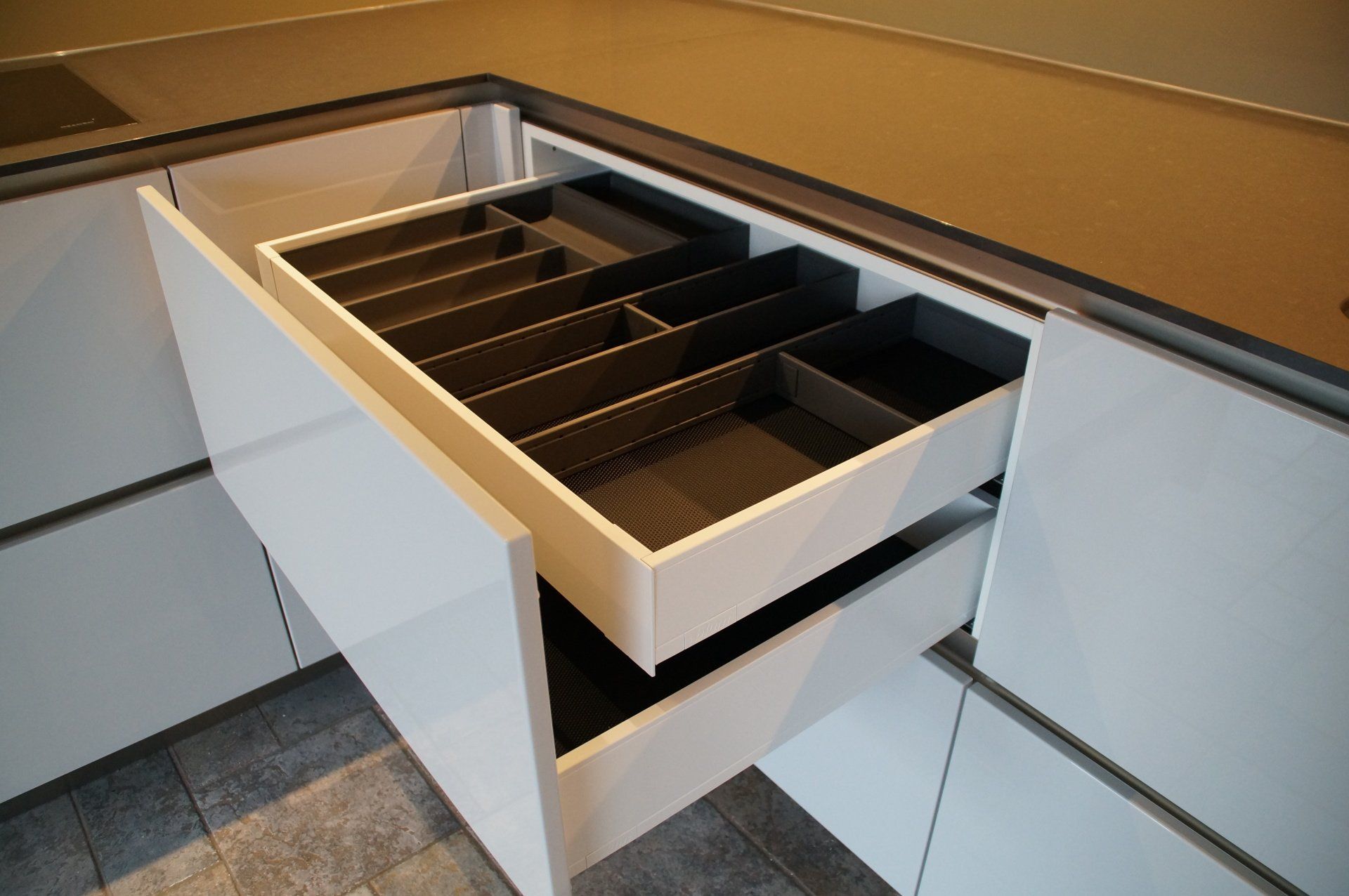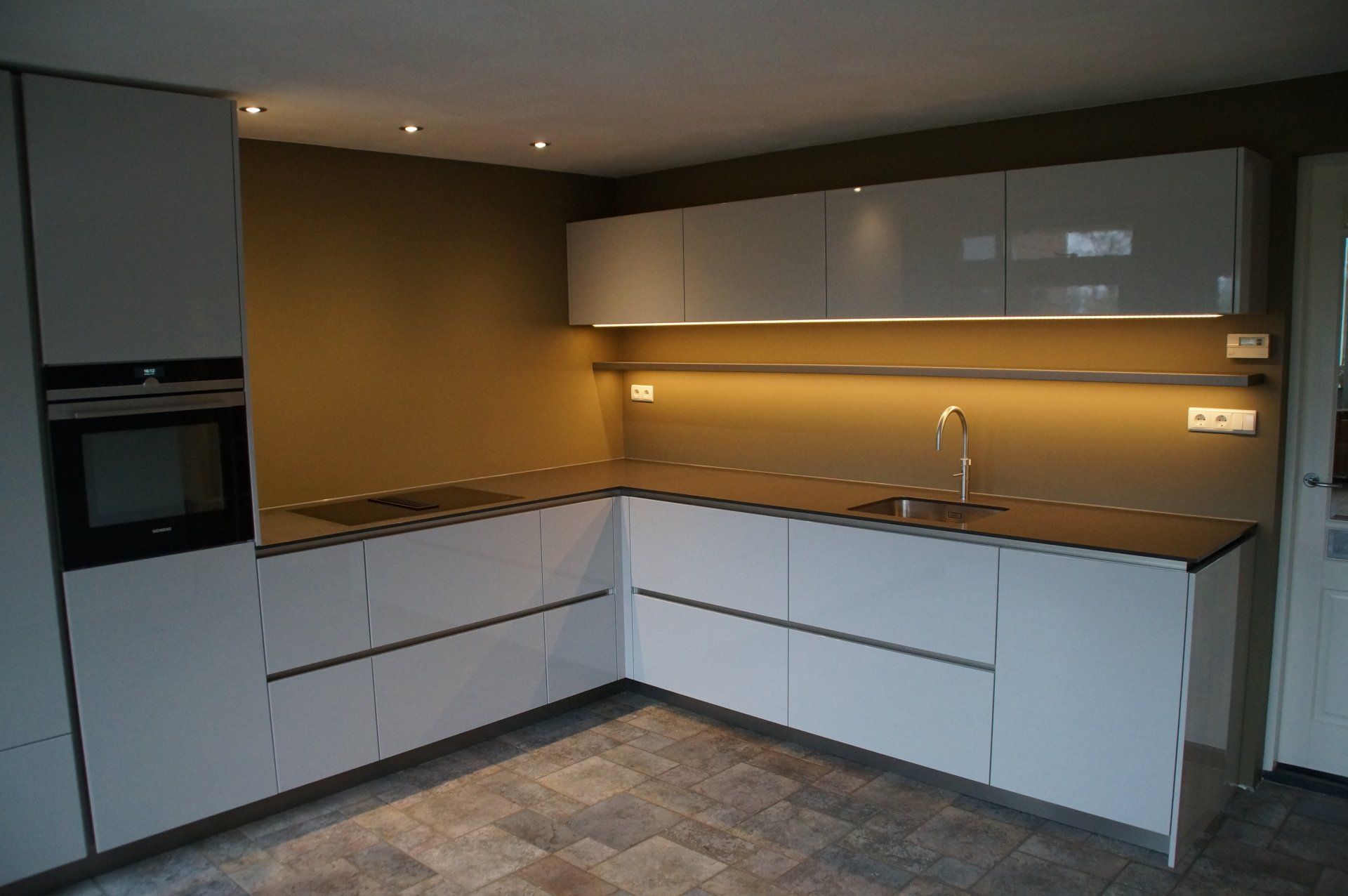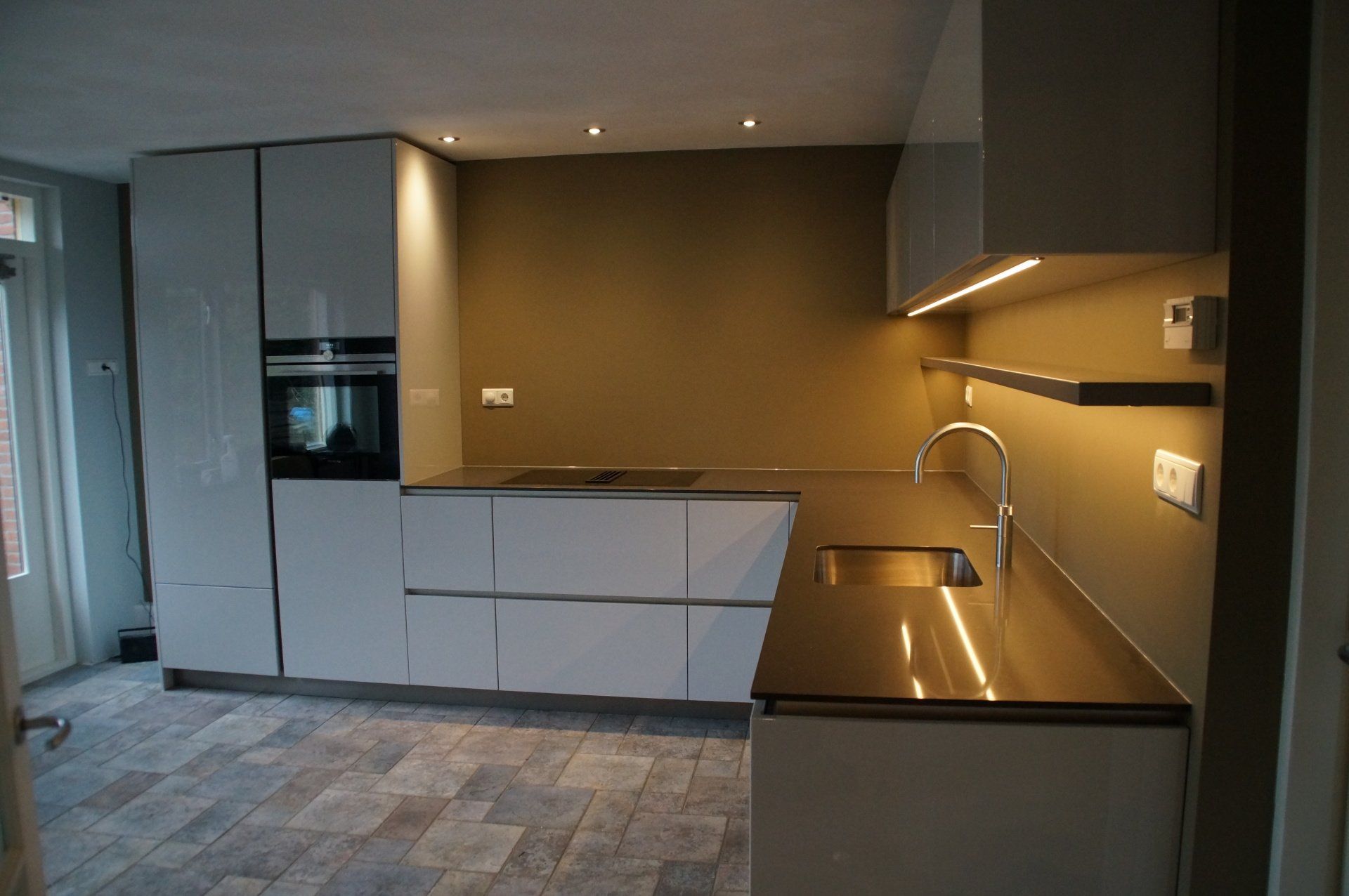 Een strakke en moderne keuken. Hoogglans grijze fronten met een donkergrijs composiet blad. De kookplaat is voorzien van een geïntegreerde afzuigunit.