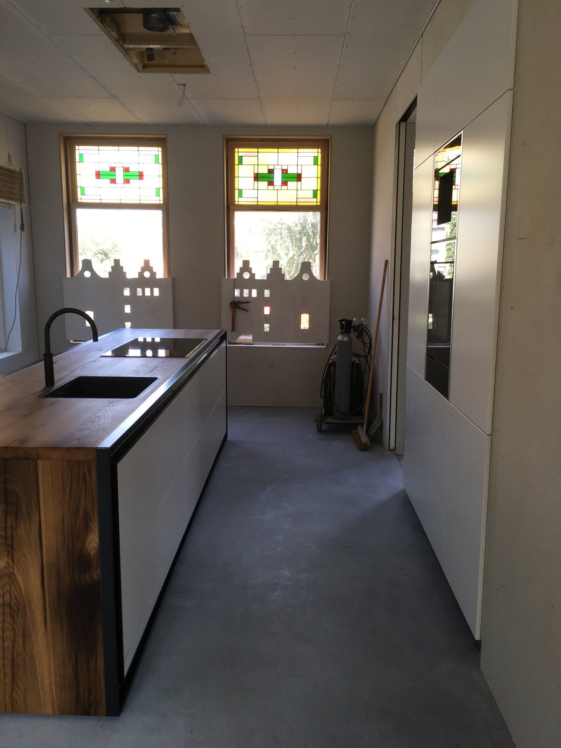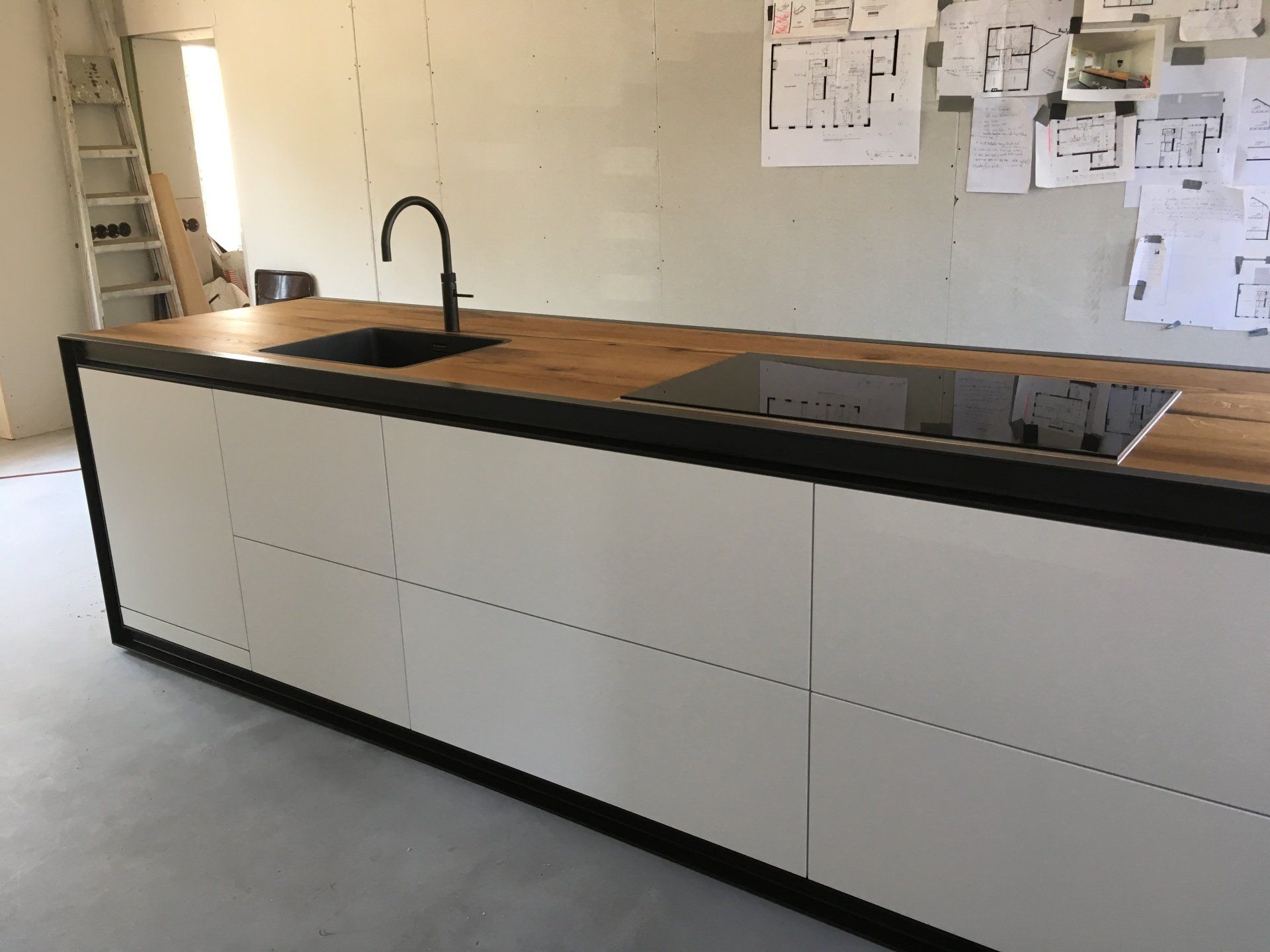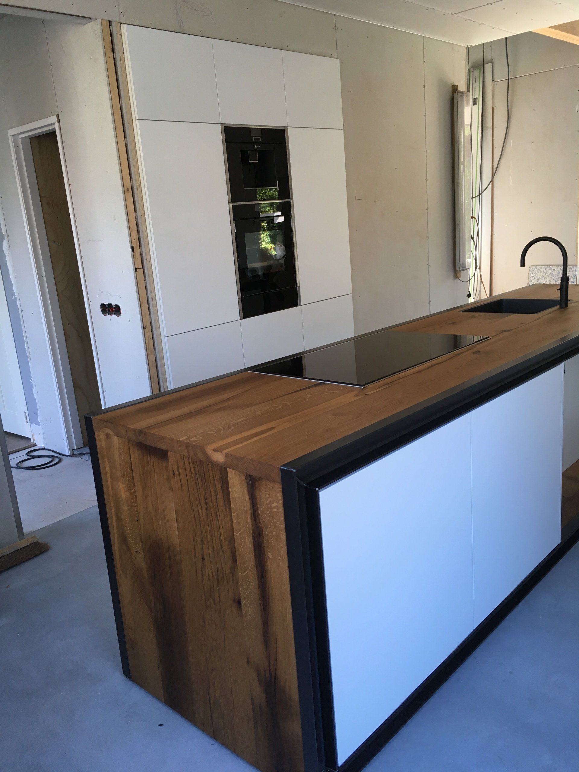 Een bijzondere keuken met een oud eiken blad met een rondom zwart staal u-profiel,