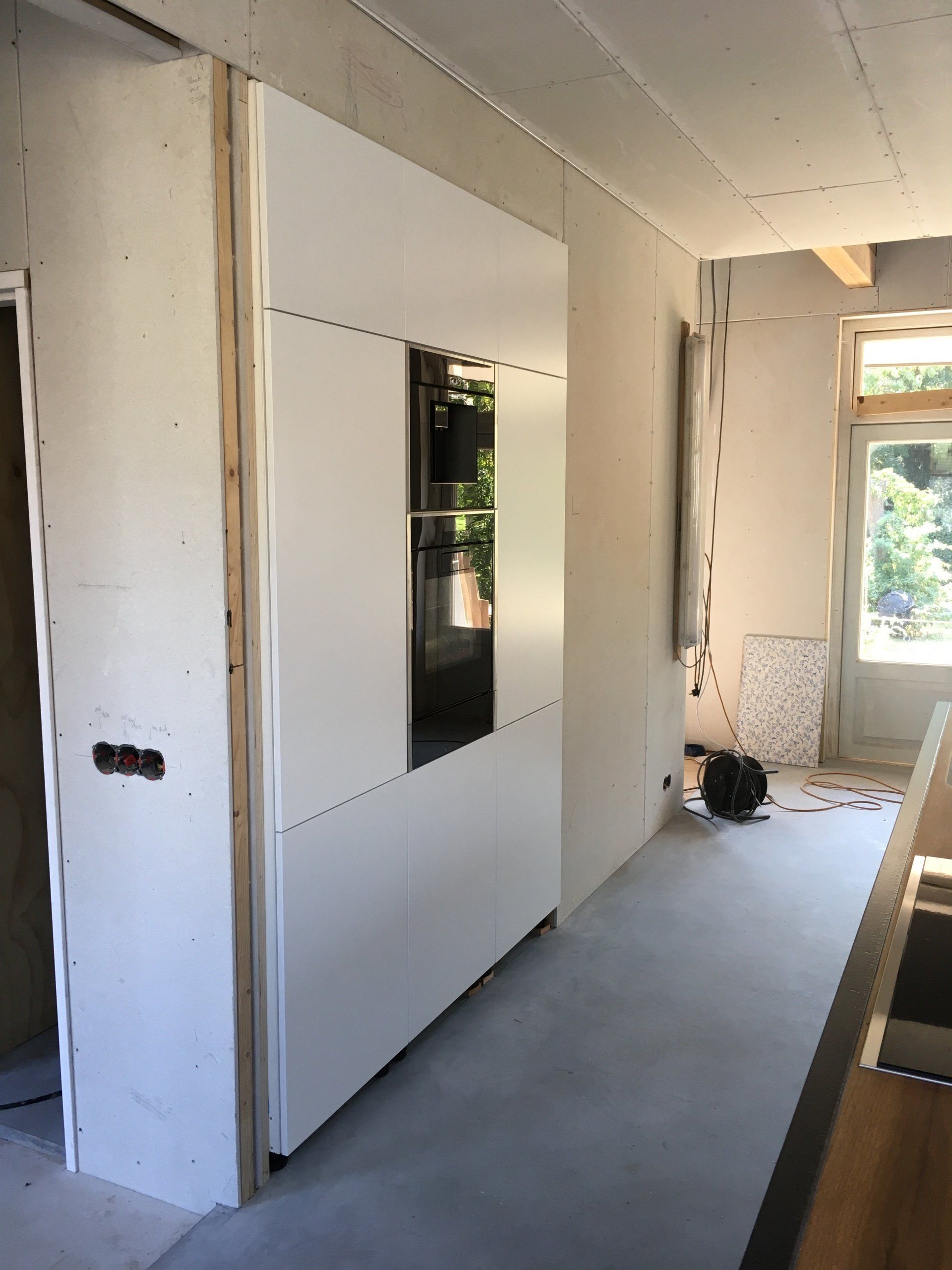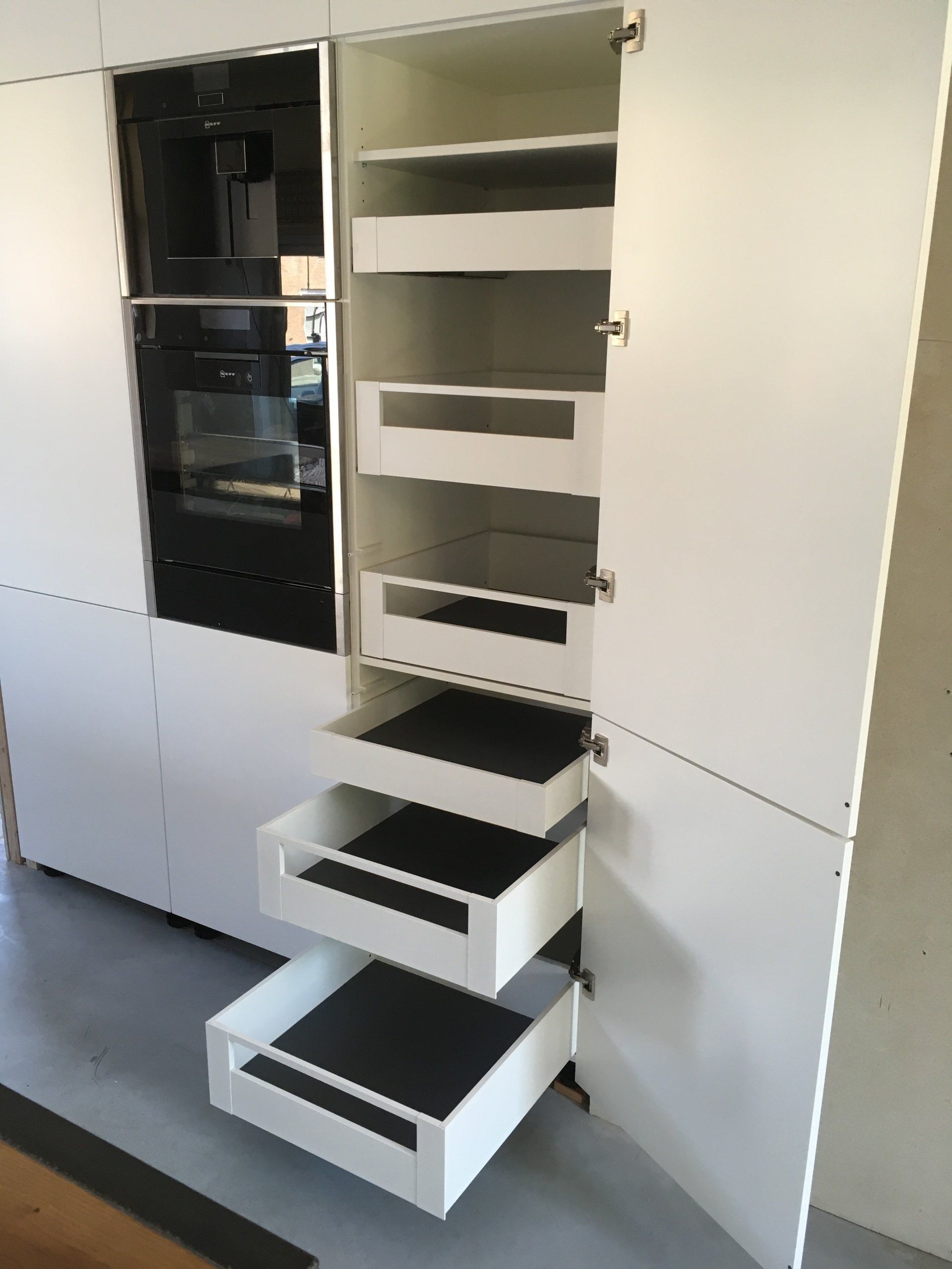 Hoge kasten, wit gespoten, met veel laden elektrisch ondersteund voor extra opberg gemak.