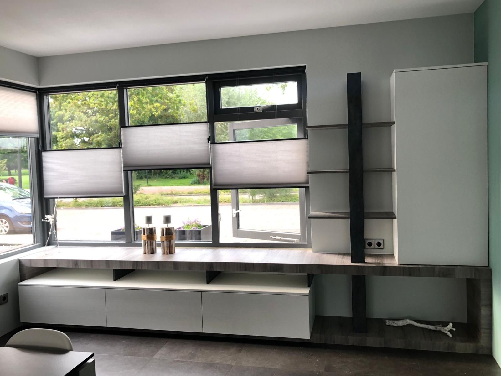 Een typisch voorbeeld van maatwerk. Een meubel doorlopend in de vensterbak, exact klem tussen de wanden in. Alles ontworpen door de klant zelf.